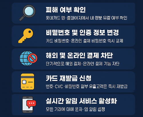 롯데카드 앱과 홈페이지를 통한 확인 절차는 물론, 비밀번호 변경과 카드 재발급 같은 실질적 대응이 필요한 시점입니다.